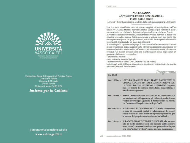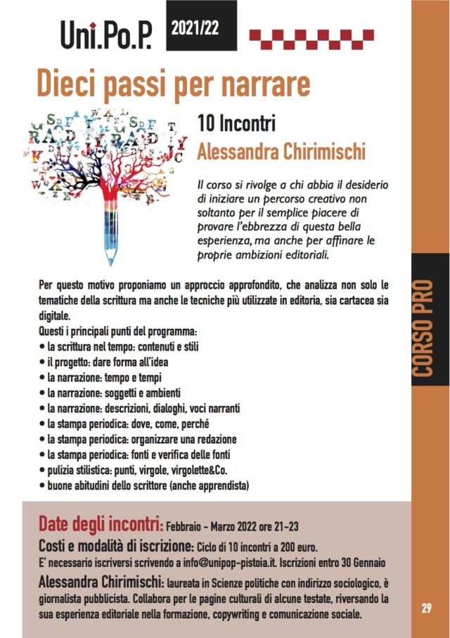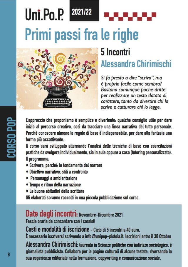 Da dicembre 2021 collaboro con Università Popolare Pistoia tenendo corsi di scrittura: di seguito, alcune locandine con i programmi formativi.