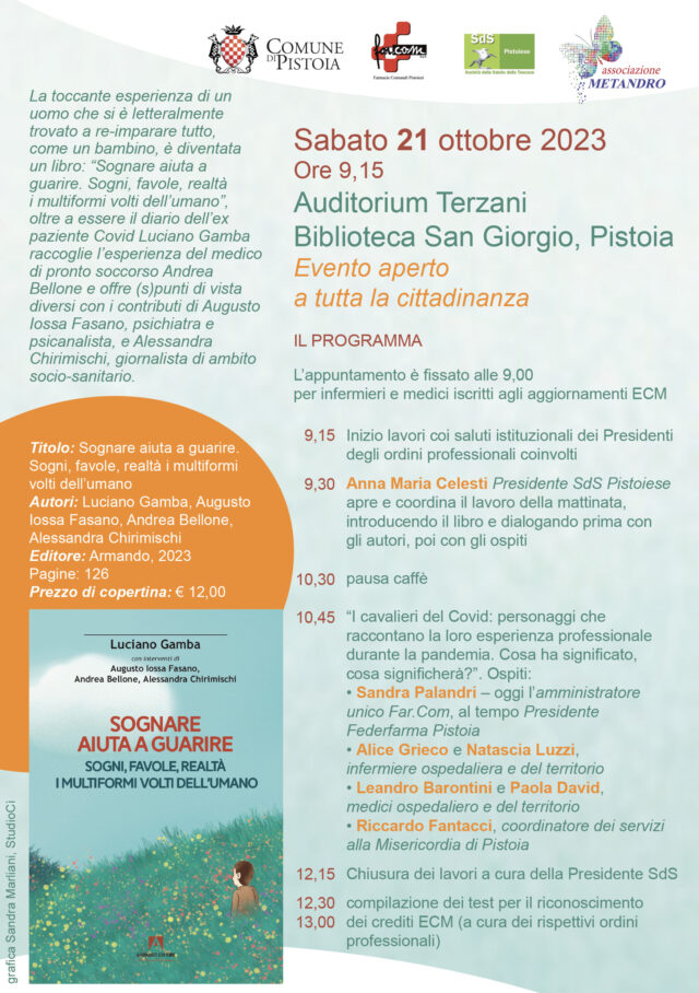 Presentato alla Biblioteca San Giorgio di Pistoia il libro “Sognare aiuta a guarire”. L’incontro – che ha avuto come moderatore la D.ssa Anna Maria Celesti – ha coinvolto Ordine degli Infermieri delle provincie di Firenze e Pistoia, l’Ordine dei Medici di Pistoia e ha trovato la collaborazione della facoltà di Scienze Infermieristiche che ha ritenuto interessante invitare i propri allievi a partecipare all’incontro.
