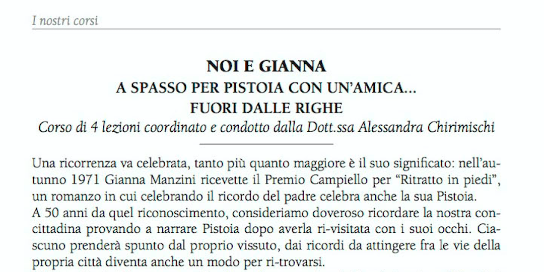 Per ricordare i 50 anni dal conferimento a Gianna Manzini del Premio Campiello per “Ritratto in piedi”, con Maria Stella Rasetti – Direttrice della Biblioteca San Giorgio di Pistoia – e Rossella Baldecchi – l’artista autrice del trittico dedicato alla Manzini e al suo libro – il 16 settembre 2021 è stato organizzato un convegno al quale hanno preso parte personaggi significativi nel mondo letterario italiano e internazionale (come potete leggere dettagliatamente nel programma allegato).