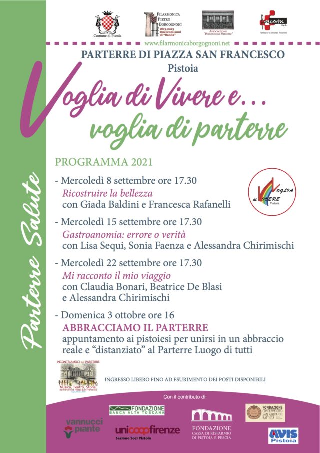 L’estate del 2021 è stata occasione per tornare a incontrarsi, e con l’Associazione Voglia di Vivere OdV e la preziosa collaborazione della Filarmonica Pietro Borgognoni, abbiamo organizzato un programma di incontri nel giardino del Parterre a Pistoia: bellezza, alimentazione, psicologia, narrazione terapeutica i temi principali trattati, coinvolgendo professionisti affermati nei diversi ambiti. Tutto si è concluso la prima domenica di ottobre con “L’abbraccio al Parterre”, manifestazione che ha sostituito la Camminata in Città, impossibile da svolgere a causa della pandemia.